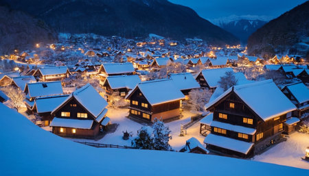 A serene snow covered village with traditional houses and glowing lights