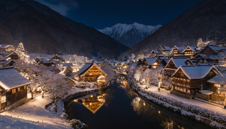 An winter night unfolds in a traditional Japanese village, with Gassho-zukuri houses glowing warmly and their reflections shimmering in the dark river.