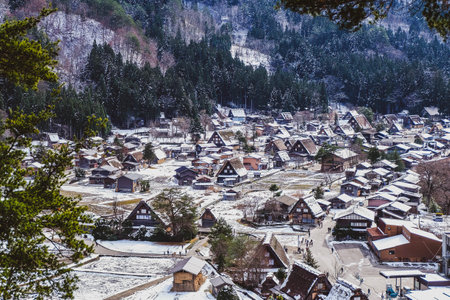 Historic Villages of Shirakawa-go, Japan in snowy day, film tone, classic look.