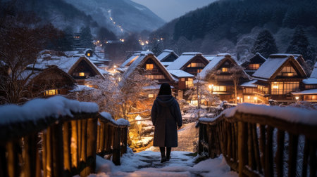 Young woman traveler looking at the beautiful UNESCO heritage village in the snow in winter at Shirakawa-go, Japan in twilight time