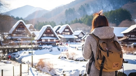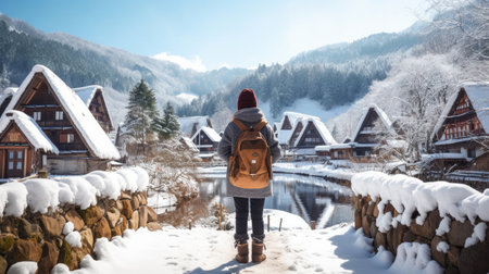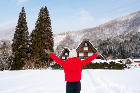Young happy female traveler enjoying at Shirakawago with snow in winter, Japan