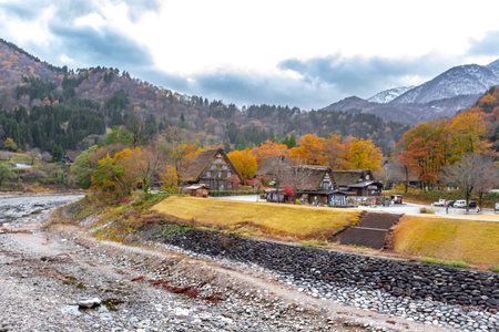 top view of Shirakawa-go village during Autumn Season on October in Japan. There is a famous historic village. And has been inscribed by The UNESCO. The tree was changing color leaves from green to orange and some red. Autumn image.
