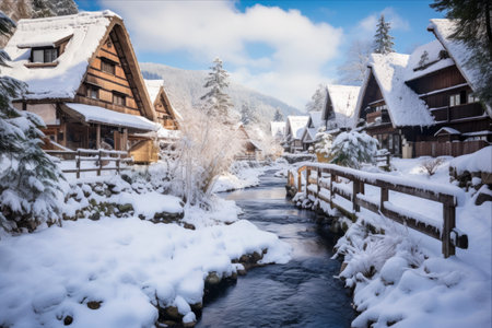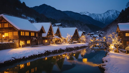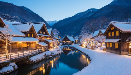 A cozy, snow-covered Japanese village with thatched-roof houses.