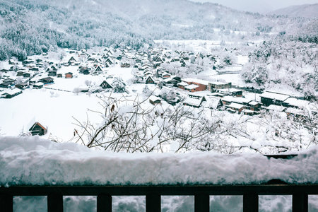 Top view of Shirakawa-go villages in snowfall day, Gifu prefecture Japan, Village hill view point in snowing fall winter