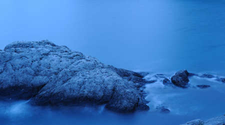 Blue sunset at rocky coast of sea. Slow shutter speed for smooth water level and dreamy effect
