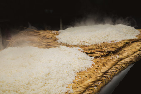 A freshly prepared rice is carefully arranged in traditional wooden container, showcasing meticulous process of rice handling in serene setting