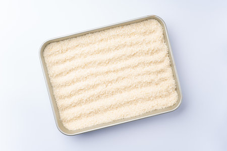 Rice grains in a square-shaped container, top view with white background and copy space for product labels
