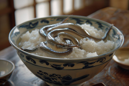 A snake coiled up in a bowl of rice, Imagine a surreal scene where eels are gracefully swimming around a bowl of perfectly cooked rice