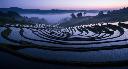 Rice terraces at twilight, with winding water channels reflecting the fading light and a misty landscape in the background, showcasing agricultural beauty.