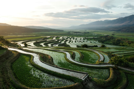 A serene landscape of rice terraces at sunset in a mountainous valley