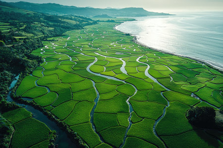 Stunning aerial shot of vibrant green rice paddies. The intricate lines of the terraces create a captivating pattern.