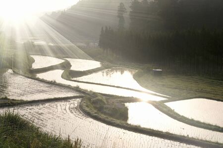Morning sun, sky and paddy fields in the mountains