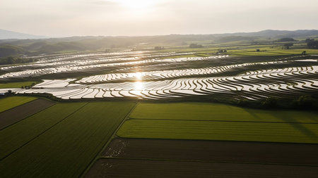 Aerial view of terraced rice paddies reflecting the sunset, with green fields and distant hills under a hazy sky.