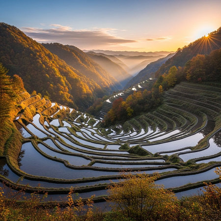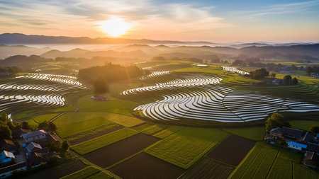 Reflection showing sunrise over terraced rice paddies reflecting the golden sun and sky in a serene mountainous landscape with scattered villages keywords: rice...