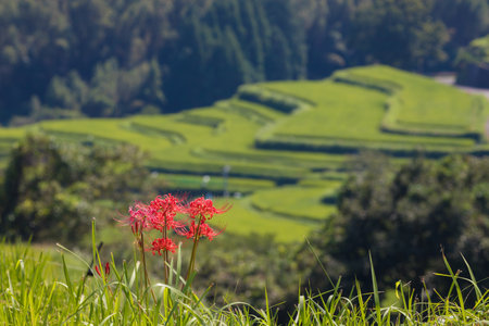 Japanese countryside rural landscape with red cluster amaryllis blooms Oniki terraced rice field, Hasami-machi, Higashisonogi-gun, Nagasaki