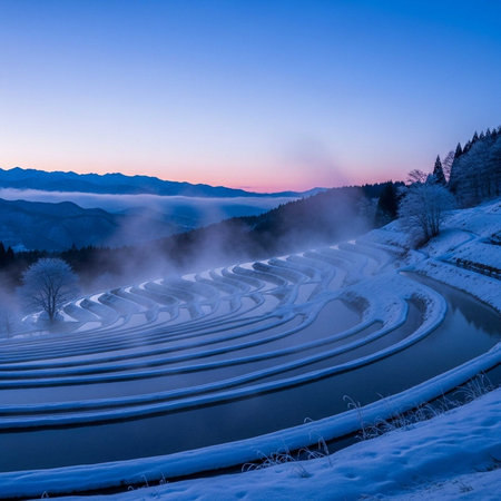 Snow-covered terraces and misty mountains at dawn