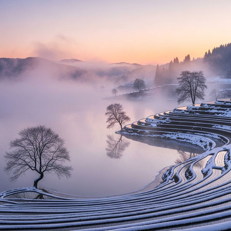 Serene winter scene with fog, snow, and terraced fields