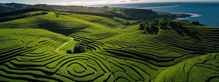 An Aerial view of peaceful rice terrace landscape with vibrant green fields