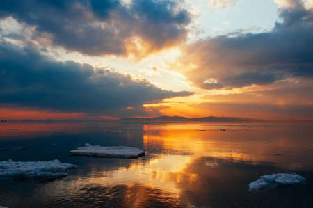Incredible and beautiful sunset on the sea against the background of mountains. Sea calm water in which ice melts and small pieces of glaciers float.