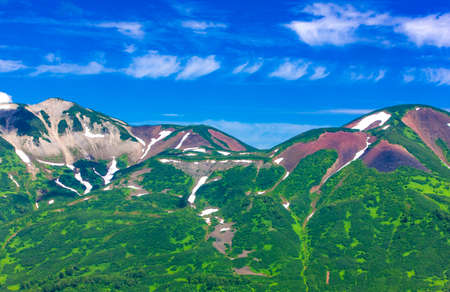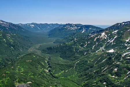 A picturesque mountain range against a clear blue sky. There is lush green vegetation on the slopes. The forest is at the foot. copyspace. Kamchatka
