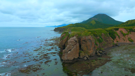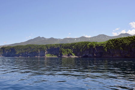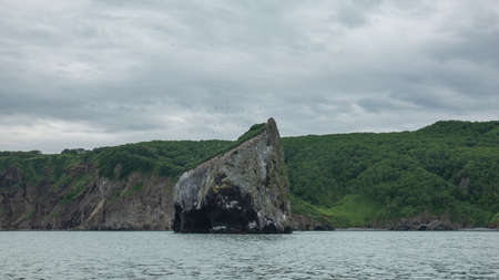 A picturesque cliff in the Pacific Ocean. Bird nesting sites on rocky slopes. Green coastal hills against a cloudy sky. Kamchatka. Avacha Bay