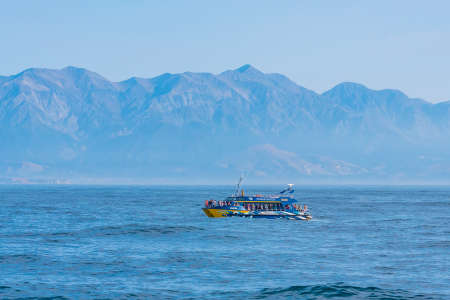 KAIKOURA, NEW ZEALAND, FEBRUARY 3, 2020: Tourist boat on a way to see sperm whales at Kaikoura, New Zealand