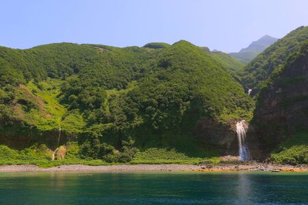 coastal landscape, pebble beach and beautiful wooded rocks on the green coast of Kunashir island