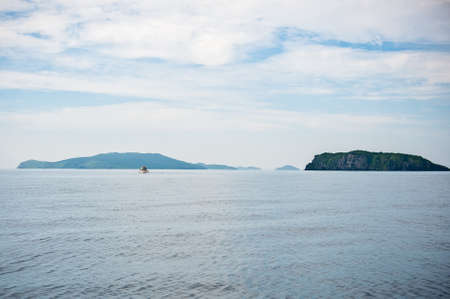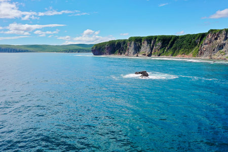 A picturesque green island and sheer cliffs rise above the Pacific Ocean. Blue sky with clouds. Ripples on the water. Kamchatka. Avacha Bay