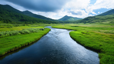 A river flows through a grassy valley with mountains in the background. The water is calm and clear, and the grass is lush and green. The scene is peaceful and serene