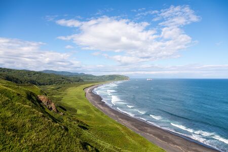 Wild beach made of volcanic sand on the Pacific Ocean, Kamchatka Peninsula, Russia.