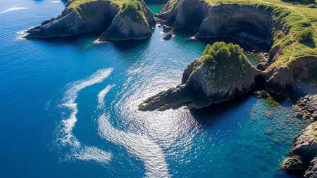 An aerial view showcasing a rugged coastline with dramatic rocky cliffs and inlets, meeting the deep blue ocean water with sunlight reflecting on the surface.
