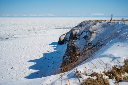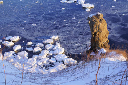 Ice floes in the sea off the wild rocky coast of Cape Tobizin on the Russian island in Vladivostok.