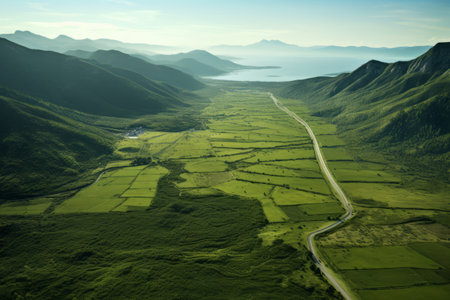 Capturing Nature's Beauty: Aerial Exploration of a Serene Green Field and Mountainous Road