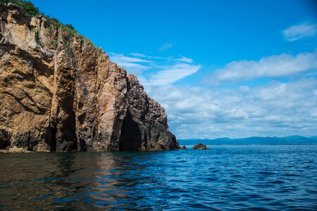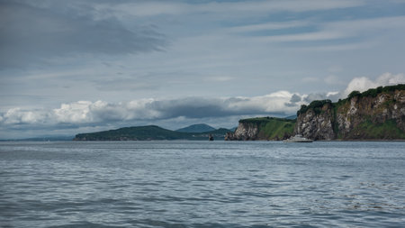 The picturesque coast of Kamchatka against the background of blue sky and clouds. Sheer cliffs and green hills. The yacht sails on the Pacific Ocean. Avacha Bay