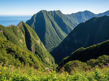 A breathtaking view of a lush green mountain range with sharp peaks and valleys, overlooking a serene sea under a clear blue sky.