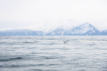 snowy mountains on shore of Pacific ocean in Avacha bay on spring day near Petropavlovsk-Kamchatsky city, Kamchatka Krai, Russia