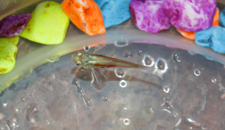 Small fish swimming in dark water with bubbles, creating a peaceful and serene atmosphere