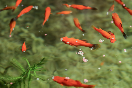 Little red fish are playing in water. A school of newborn red fish is swimming in the river where they live. Marine life. Aquatic creatures.