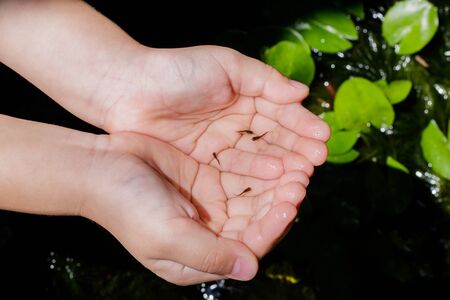 The kid holding little fish in her two hands palm up, meaning think earth and life.