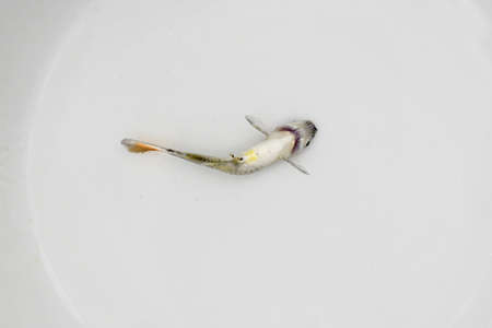 Guppy fish died due to bent spine disease. Dead Small fish on the surface of water.