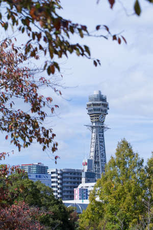 2015,Nov10 - Osaka City, Tsutenkaku clock tower is the famouse landmark old town of Osaka city, view from Tennoji Zoo public park in Autumn, 10 November 2015