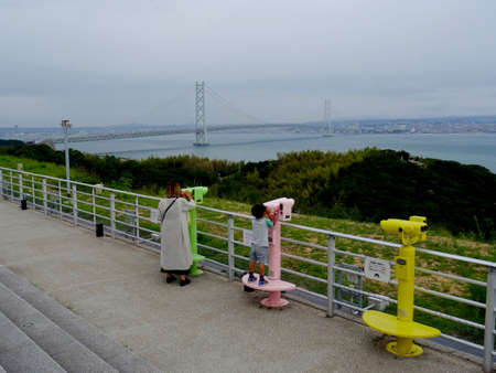 Awaji, Hyogo, Japan - 17th September 2018 : View on the Akashi KaikyÅ Bridge and some toursit looking through the binoculars from the Awaji Service Area for Sumoto, Japan