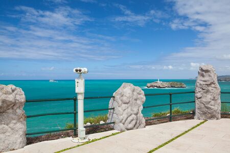 Coin-operated binoculars. Binocular telescope on the observation deck for tourism. Spyglass or telescope pointing towards the sea, city background. A telescope on the other side of the river.
