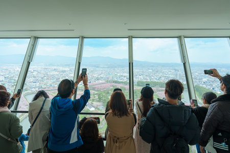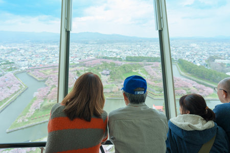 tourists Visiting in Hakodate city, Travelers sightseeing view from Goryokaku Tower with sakura cherry blossom in spring. Hokkaido, Japan, 26 April 2025
