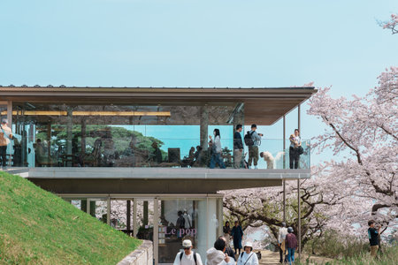 Cafe le Roman with Sakura cherry blossoms near Matsushima bay in Spring from Saigyo modoshi no matsu park near Sendai city. Miyagi Prefecture, Tohoku, Japan, 19 April 2025