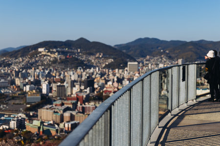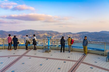Visitors Enjoying the View From Mt Inasa Observation Platform Deck in Sunny Day Sunset Time with Blue Sky Backgro und, famous beauty scenic spot in the world. Nagasaki City, Nagasaki Reflection, Japan