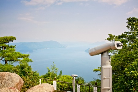 Coin operated binoculars at an overlook in Kyoto Japan on a bright sunny day.
