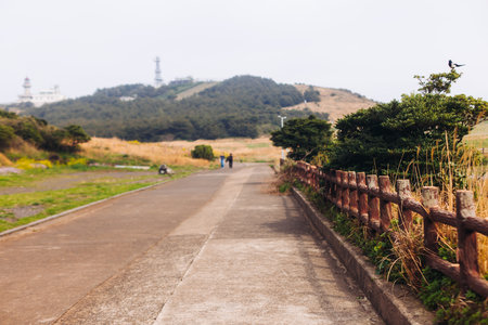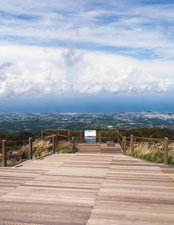 Hallasan National Park, Jeju island, South Korea, vibrant view of trail with a wooden ladder path stairs, trekking and climbing, stairway to Halla mountain summit, hiking in Korea, Jeju-do, sunny day