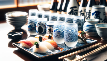 The setting highlights a selection of sushi presented on a plate, with traditional Japanese sake glasses adorned with a blue and white wave pattern gently out of focus in the background. The detailed sushi is front and center, complemented by the cultural depth of the sake ware, inviting a sense of authentic Japanese dining.