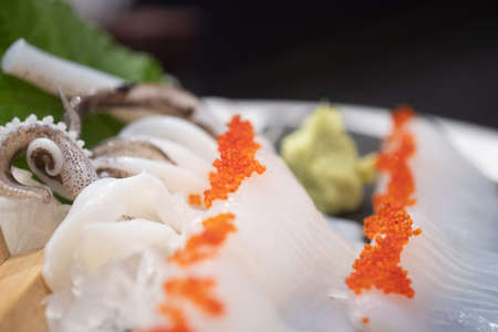Fresh of raw squid and salmon eggs, Japanese food style. Selective focus